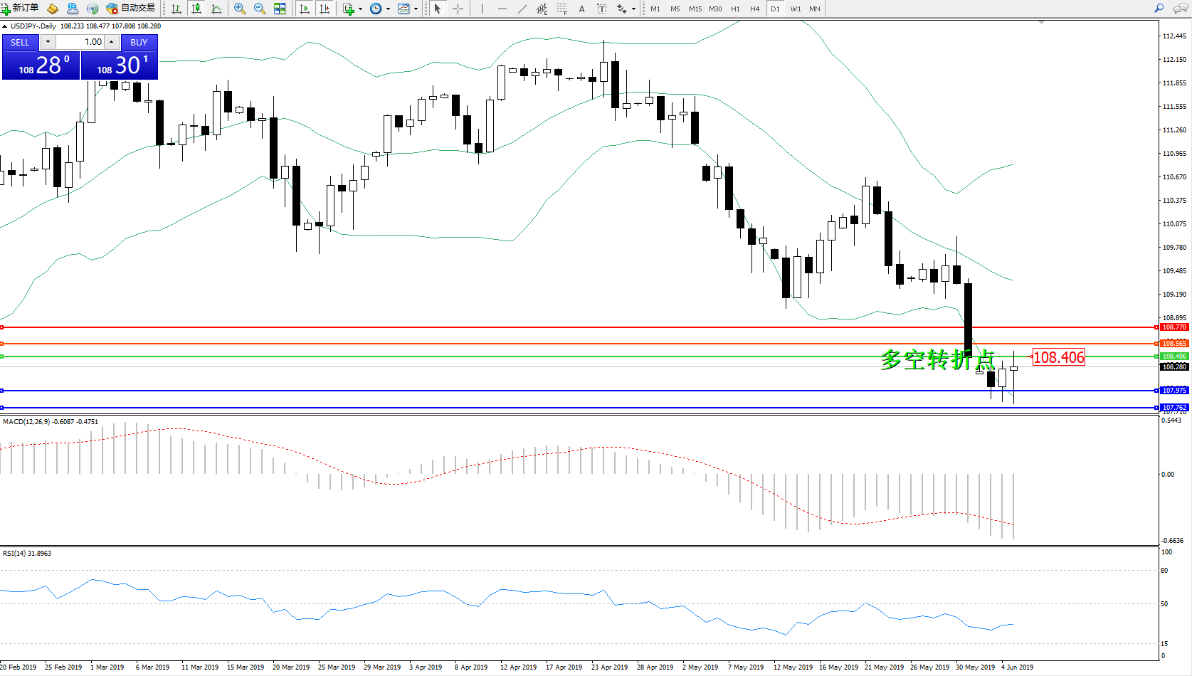 交易策略:108.406下方看跌,目标107.975、107.762
