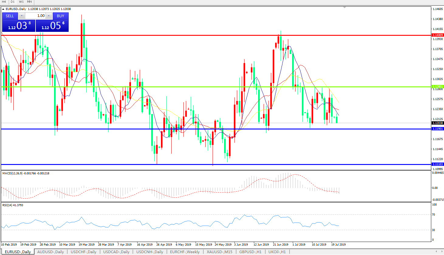 技术面简析:日图均线整体呈下行趋势,汇价大跌后昨日弱势微跌,MACD运行于0轴下方且动能柱有放量迹象,RSI缓慢走低,预计短期汇价大概率将延续弱势下行态势,重点关注下方1.1190附近第一支撑是否有效。