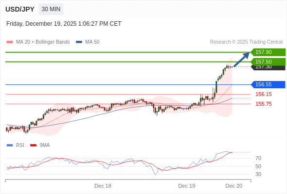 在 156.55 之上,看涨,目标价位为 157.50 ,然后为 157.90 。