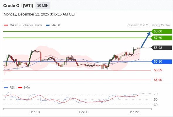在 56.10 之上,看涨,目标价位为 57.60 ,然后为 58.00 。