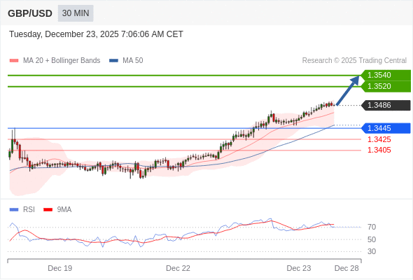 在 1.3445 之上,看涨,目标价位为 1.3520 ,然后为 1.3540 。