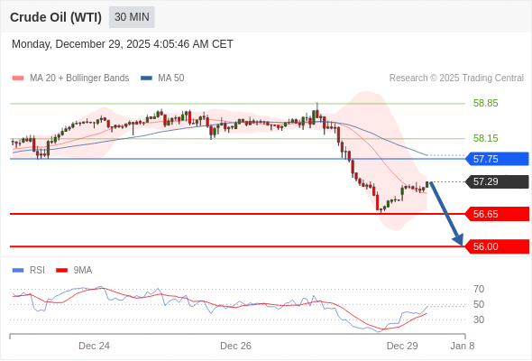 交易策略: 在 57.75 之下,看跌,目标价位为 56.65 ,然后为 56.00 。