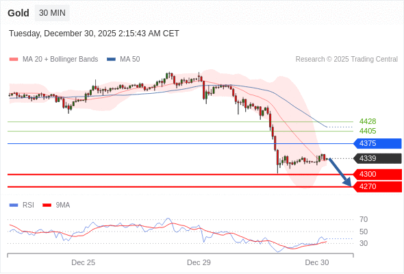 在 4375 之下,看跌,目标价位为 4300 ,然后为 4270 。