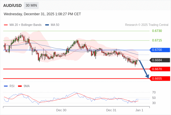 在 0.6700 之下,看跌,目标价位为 0.6670 ,然后为 0.6655 。