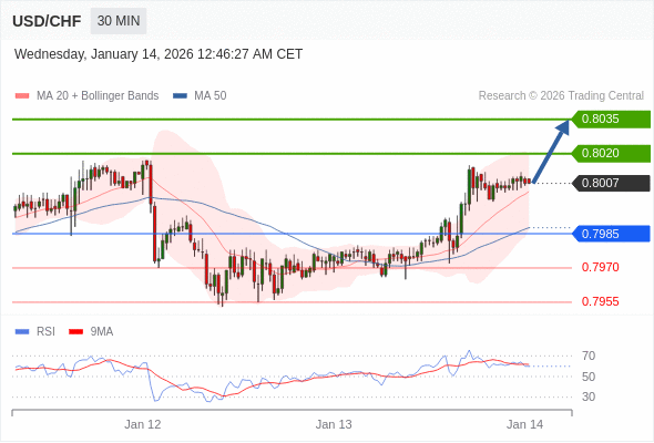 在 0.7985 之上,看涨,目标价位为 0.8020 ,然后为 0.8035 。
