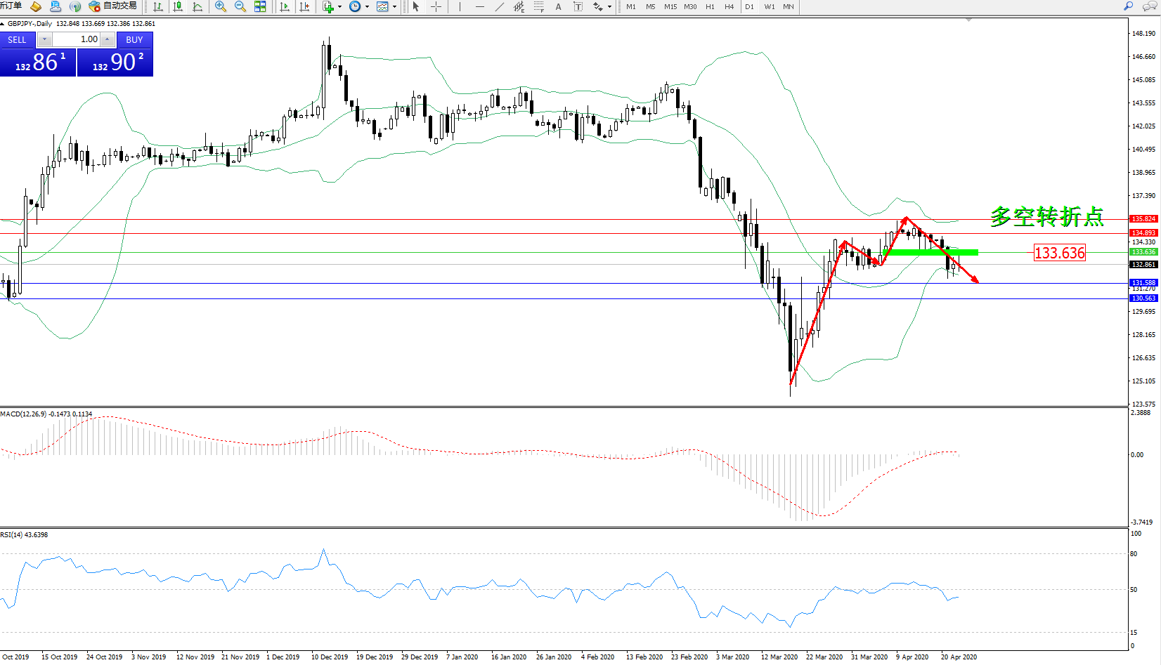 交易策略:133.636下方看跌,目标131.588130.563