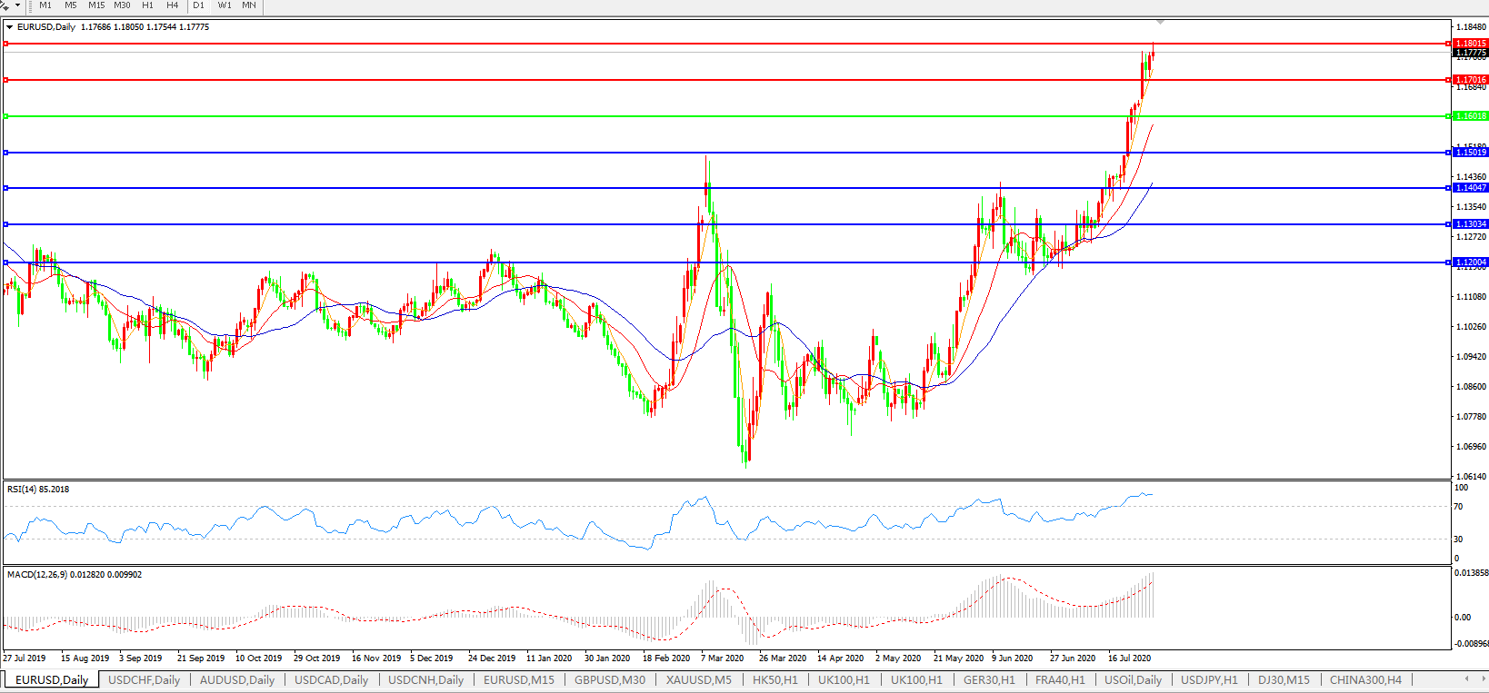 技术面简析:日图均线维持多头排列,汇价回落整理后借力上攻,MACD运行于0轴上方且量能再度回归 ,RSI开始走缓,预计短期汇价大概率将回落修正,关注1.18关口压制。