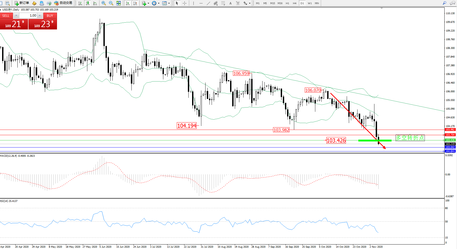 交易策略:103.426下方看跌,目标103.042、102.843