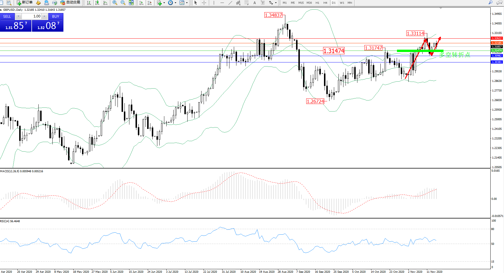 交易策略:1.31474上方看涨,目标1.32185、1.32622