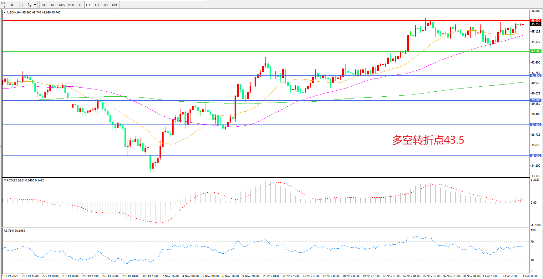 周五(12月4日),OPEC大会结果出炉!会议最终结果为2021年1月开始阶梯式增产,不及此前市场预期,但由于本周OPEC+会议推迟两日结束且谈判过程略显艰难,市场已对即将增产有所准备,美国WTI原油延续震荡上行,收报45.70美元/桶。