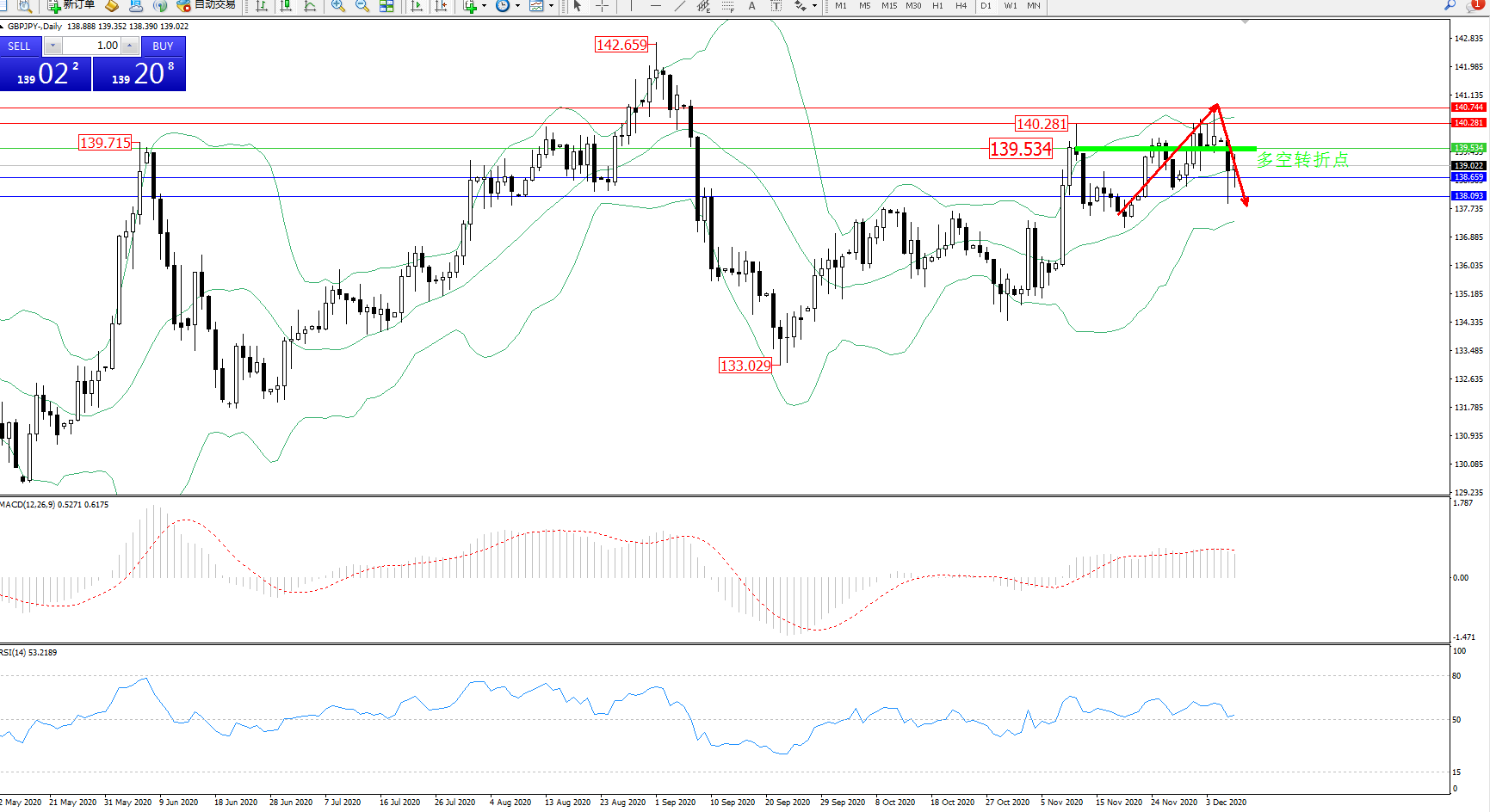 备选策略:139.534上方看涨,目标140.281、140.744