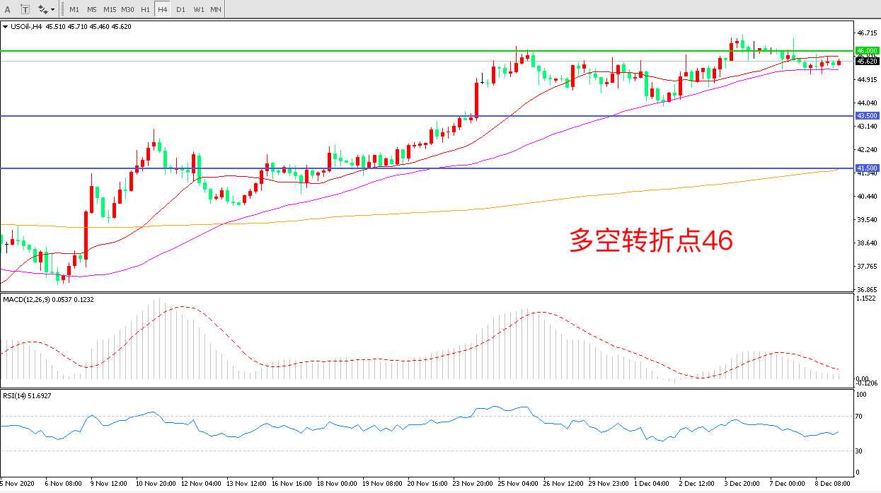 4小时图看,油价延续高位震荡,46美元成为多空分水岭,55周期均线成为短期支撑,MACD红柱减少,RSI指标走平,日内延续震荡概率较大。