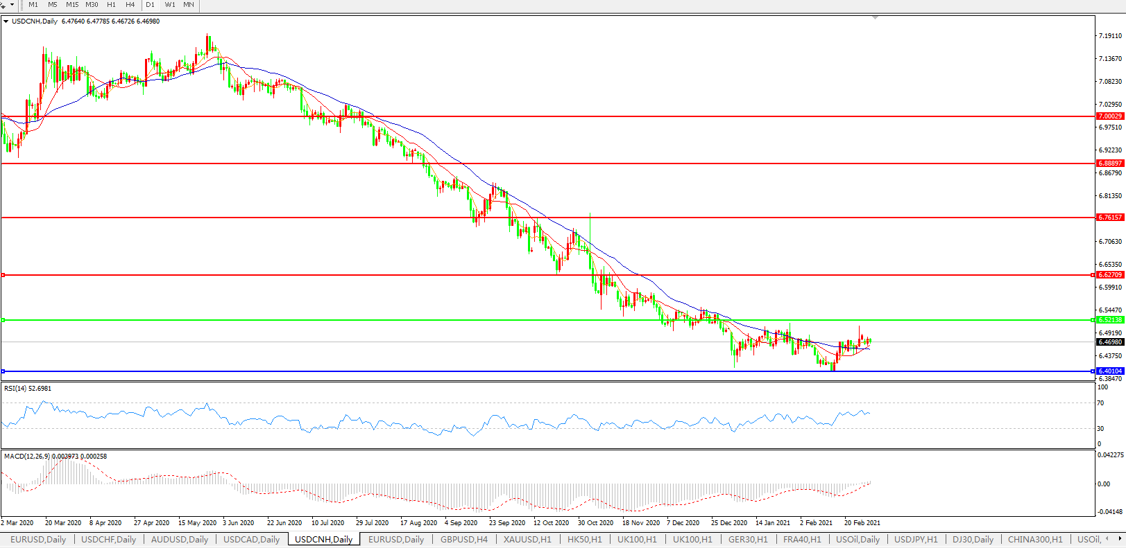 备选策略: 在6.5200之上,看涨,目标价位为6.6300,然后为6.7615。