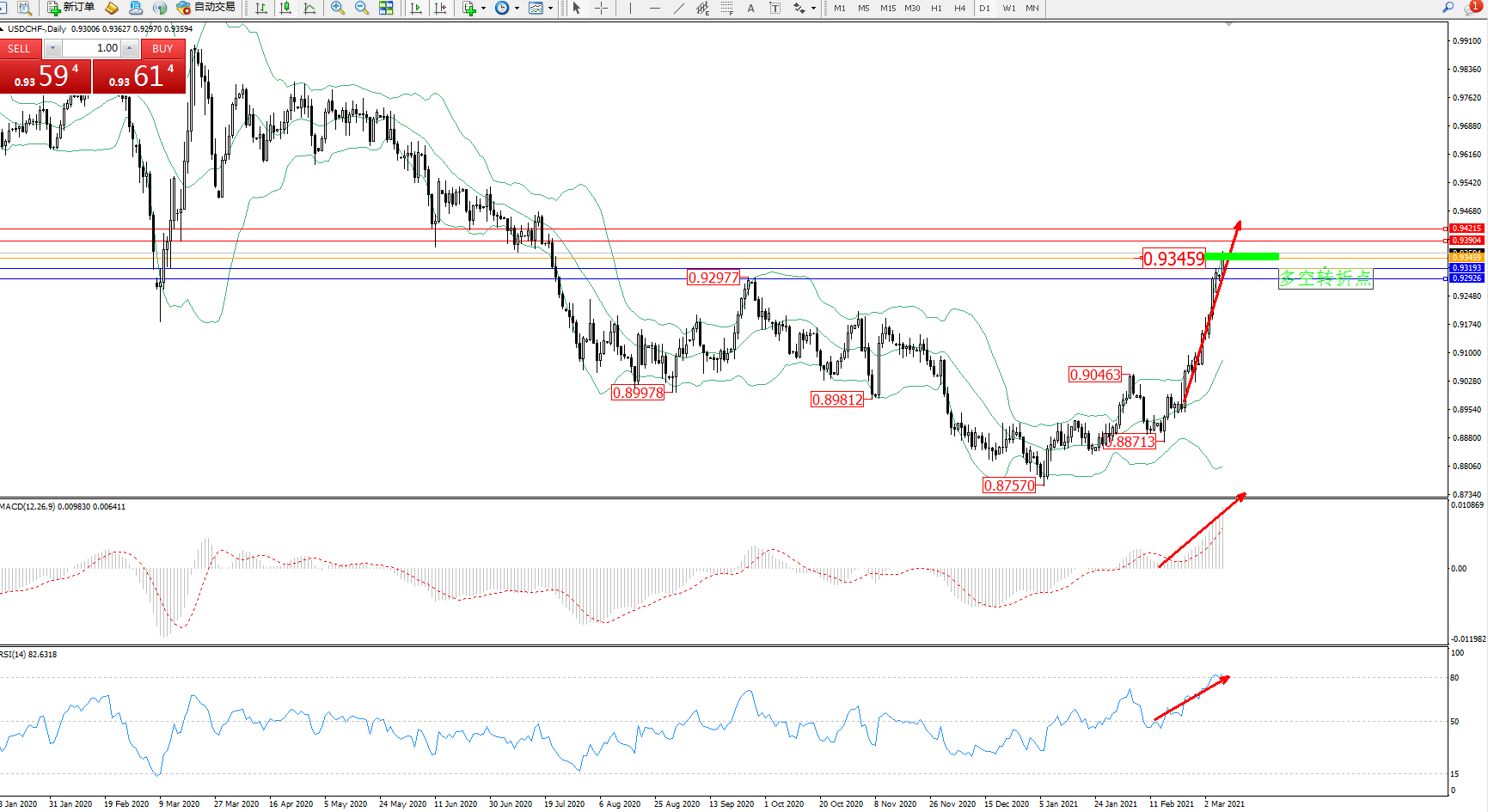 技术点评:多头动力延续布林带指标上轨附近节点持续震荡上扬,且未见止步迹象,布林带指标呈张口走势持续中,前期高位0.92977位置节点已然破位,且继续向上移动态势,MACD指标处于多头区域维持震荡持续向上移动中,RSI指标处于多头区域维持震荡上移至超买区80均衡线附近节点整理;