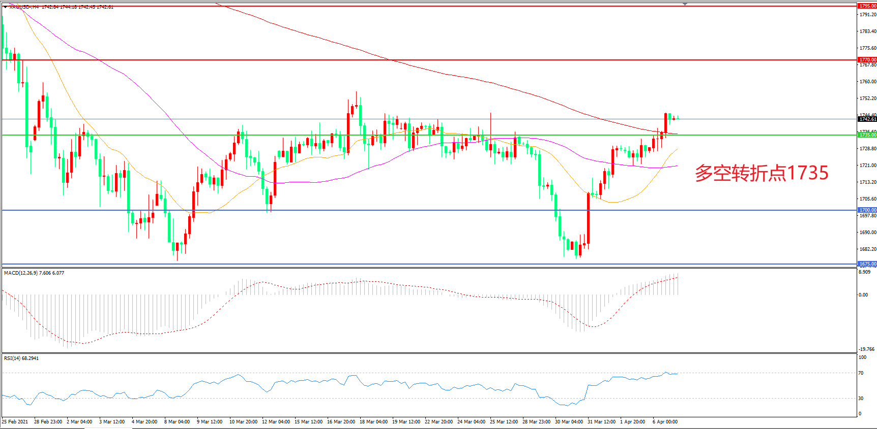 周二(4月6日),美国数据继续延续强势表现,美债收益率持续回落,美指一路下行,创两周新低,现货黄金受到提振,大幅上行后收报1743.13美元/盎司。IMF官方表示支持美联储关于耐心对待撤销宽松货币政策的立场,而美联储的宽松货币立场正是支持金价上行的因素之一,如果金价突破1750美元,则可能会进一步走高。