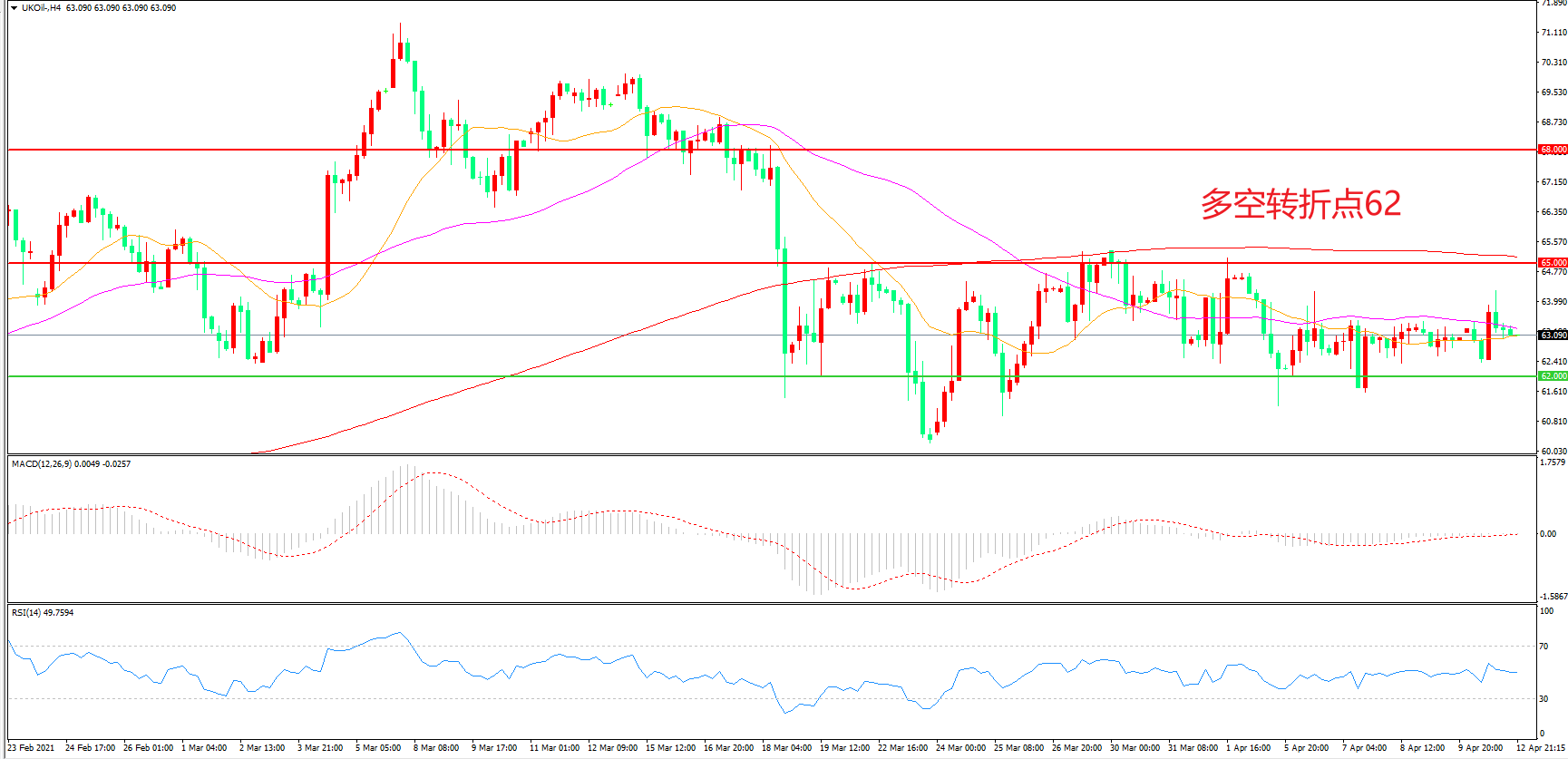 4小时图看,油价先涨后跌,区间震荡迹象明显,反弹高点逐渐减低,62美元成为短期支撑,MACD红柱增加,RSI指标走平,日内延续震荡概率较大。