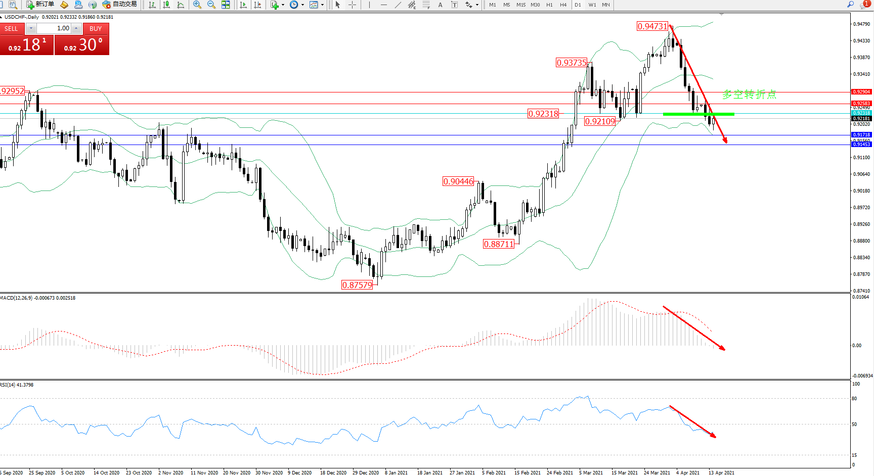 美元兑瑞郎高位下行至0.92181附近位置震荡,因美国股市表现强劲,这增加了市场风险偏好,并给避险瑞郎压力。此外美债收益率小幅度回升,也给瑞郎压力;市场对新冠疫情的担忧情绪升温,不过市场对美联储可能提前缩减QE的担忧也在升温,这限制了瑞郎的涨幅。市场预计第一财季的企业整体盈利将同比增长大约25%。不要忘记前两个季度发生了什么:大量企业业绩远超预期。业绩及格线提高了一些,但市场认为,美国企业将再次挺身而出证明目前股市估值的合理性。
