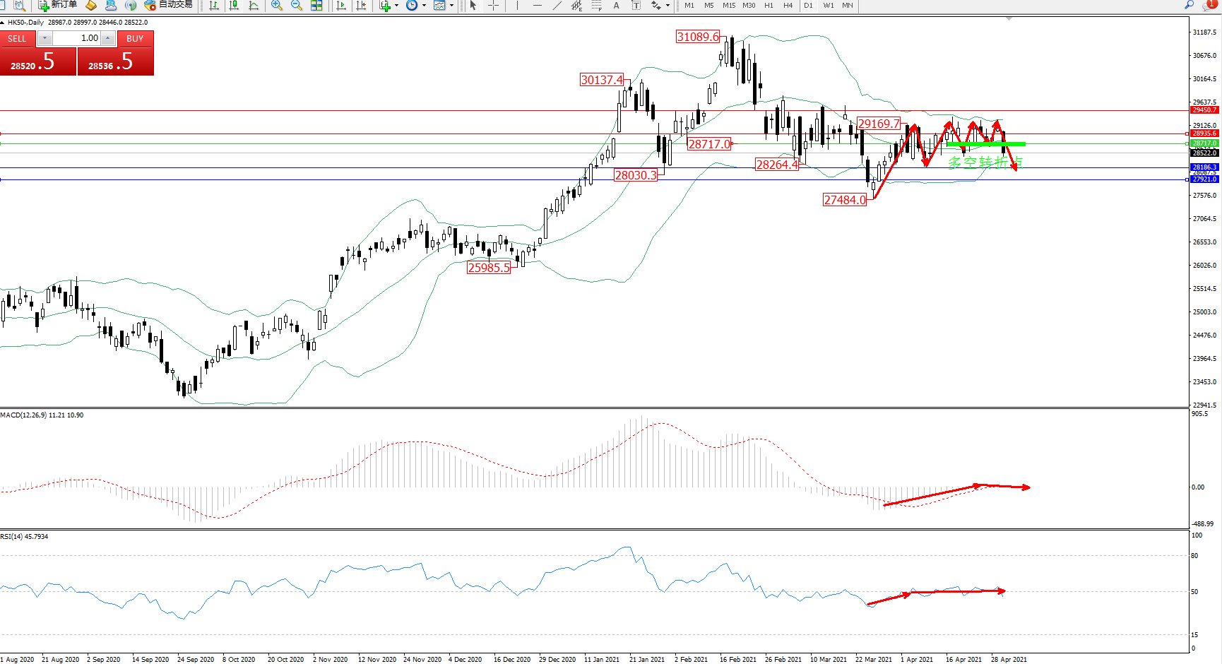 恒指HK50 ——日K线图显示: