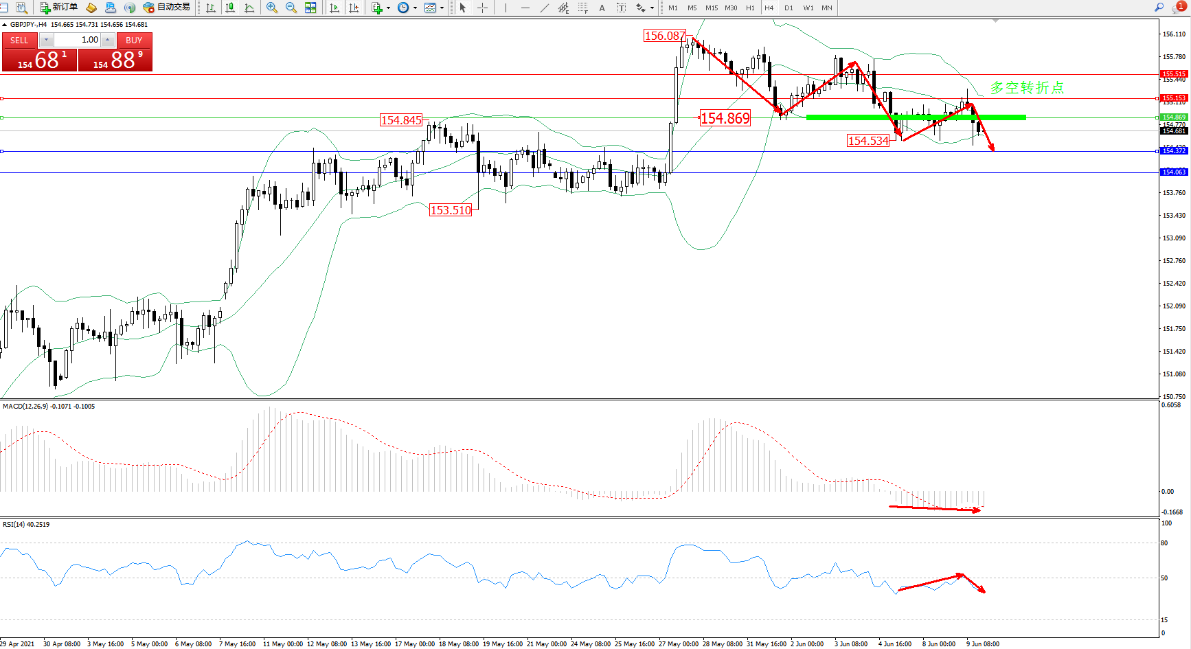 交易策略:154.869下方看跌,目标154.372、154.063