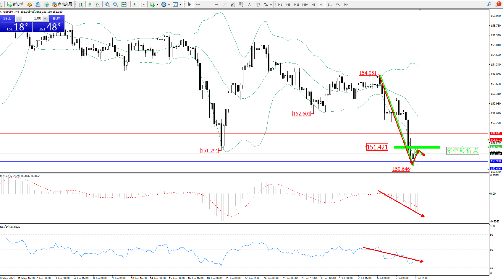 交易策略:151.421下方看跌,目标150.908、150.646