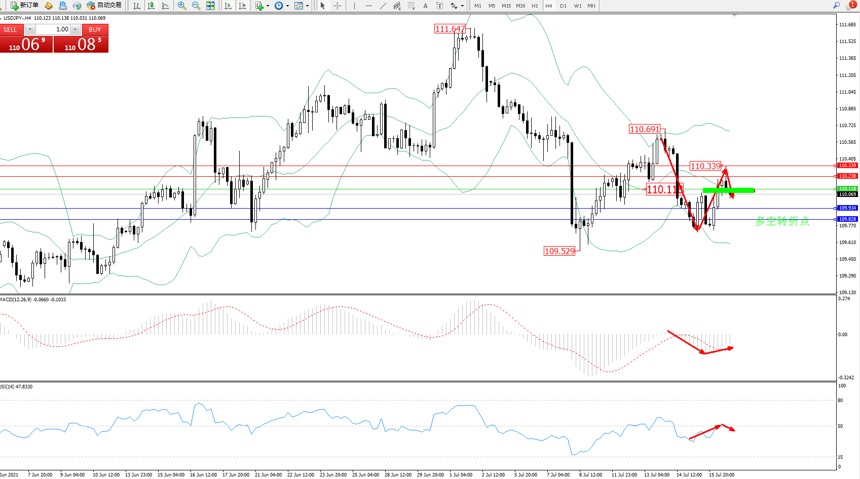 备选策略:110.118上方看涨,目标110.238、110.339
