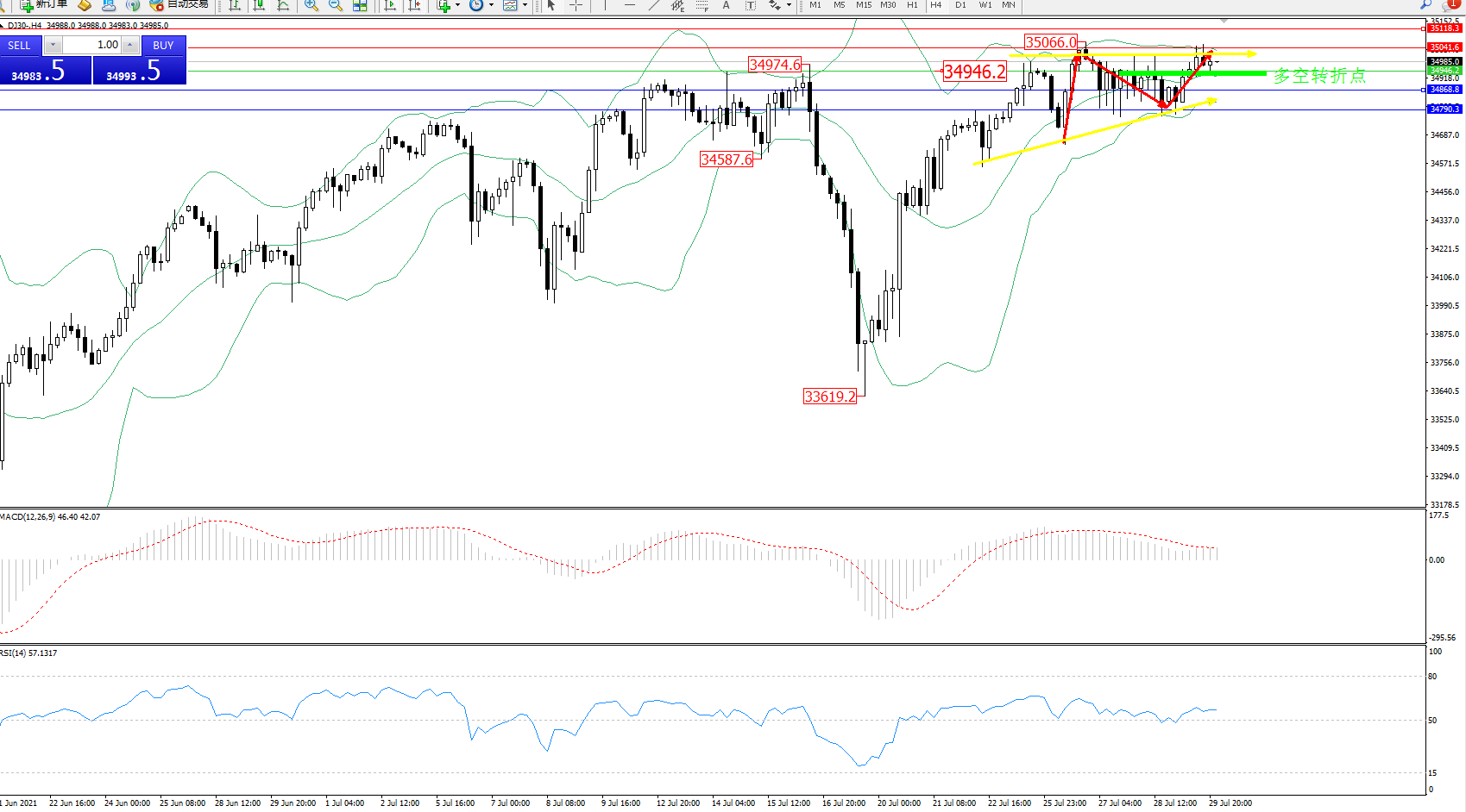 道琼斯指数DJ30——4小时K线图显示: