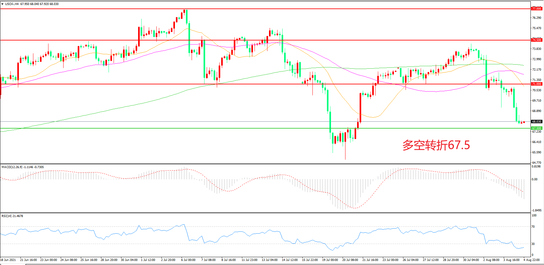 周三(8月4日),根据美国能源信息署公布的数据显示,当周EIA原油库存意外增加362.70万桶,原油库存的意外增加导致油价快速下行,美国WTI原油震荡回落,收报68.00美元/桶。目前在疫情的扰动之下,需求端似乎有放缓的迹象,这是对多头最致命的打击,倘若需求端难以配合,那么多头也就基本失去了向上拉涨的动力,除非伊朗或者中东再出现比较大的变故,否则油价回落调整的概率较大。
