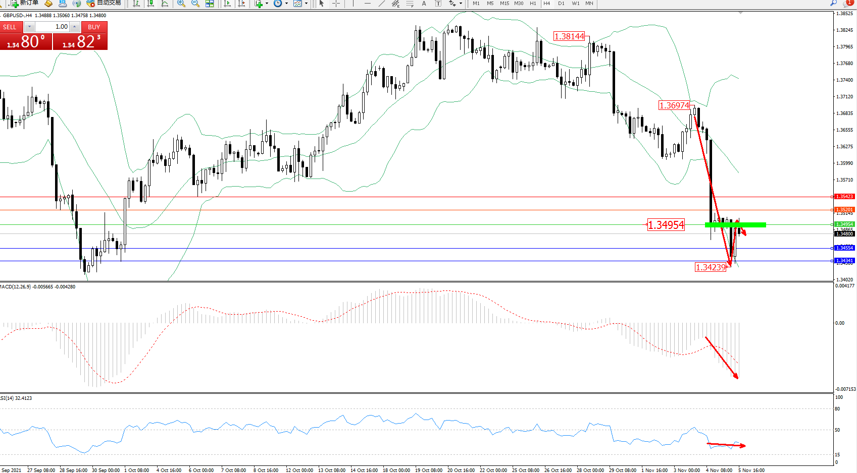 技术点评:空头动力延续布林带指标通道下轨附近节点持续震荡下行,低位抵达1.34239位置节点得到短暂支撑反转上移,但整体下行趋势态势良好,布林带指标呈张口走势后收口持续向下移动,MACD指标处于空头区域维持整理持续下行,RSI指标处于空头区域低位整理平移中;