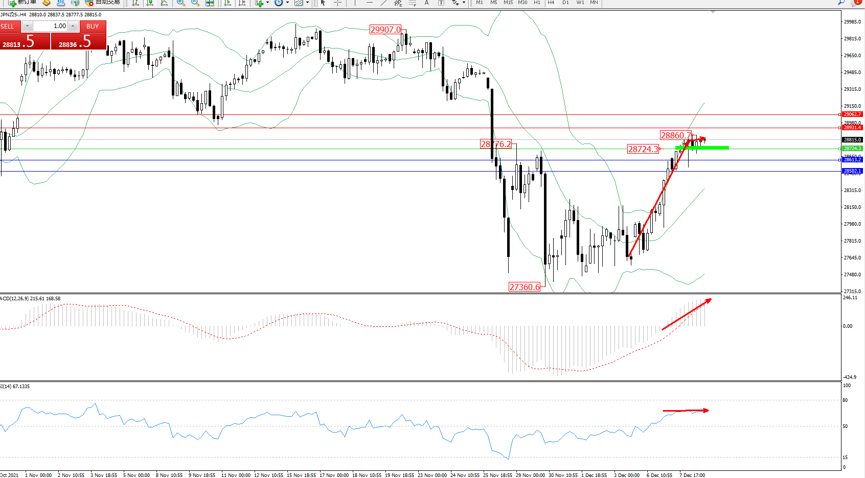 技术点评:低位多头动力延续布林带指标上轨附近持续震荡上扬,高位抵达28860附近节点后压制整理,短期多头动力有继续攀升迹象,布林带指标呈张口走势后有收口迹象,MACD指标处于多头区域持续震荡上扬,RSI指标处于多头区域持续整理平移中;