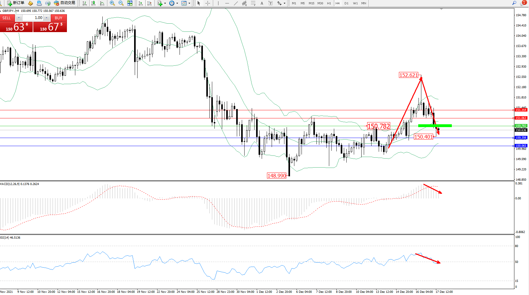 技术点评:多头动力延续布林带指标上轨附近持续震荡上扬,高位抵达152.621位置节点后急速下挫,跌破布林带指标中轨进入中轨下方不断整理下行中,布林带指标呈收口走势持续中,MACD指标处于多头区域高位整理缓慢下行,RSI指标处于多头区域维持震荡下行至50均衡线下侧整理;