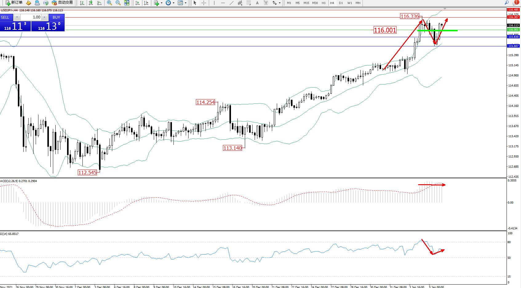 交易策略:116.001上方看涨,目标116.307、116.485