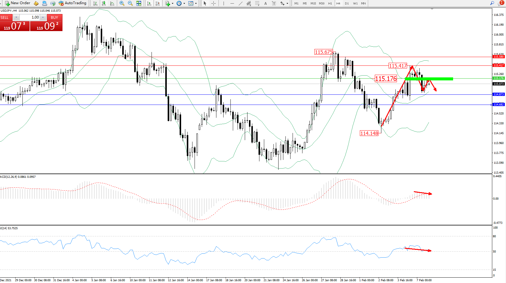 交易策略:115.176下方看跌,目标114.873、114.682