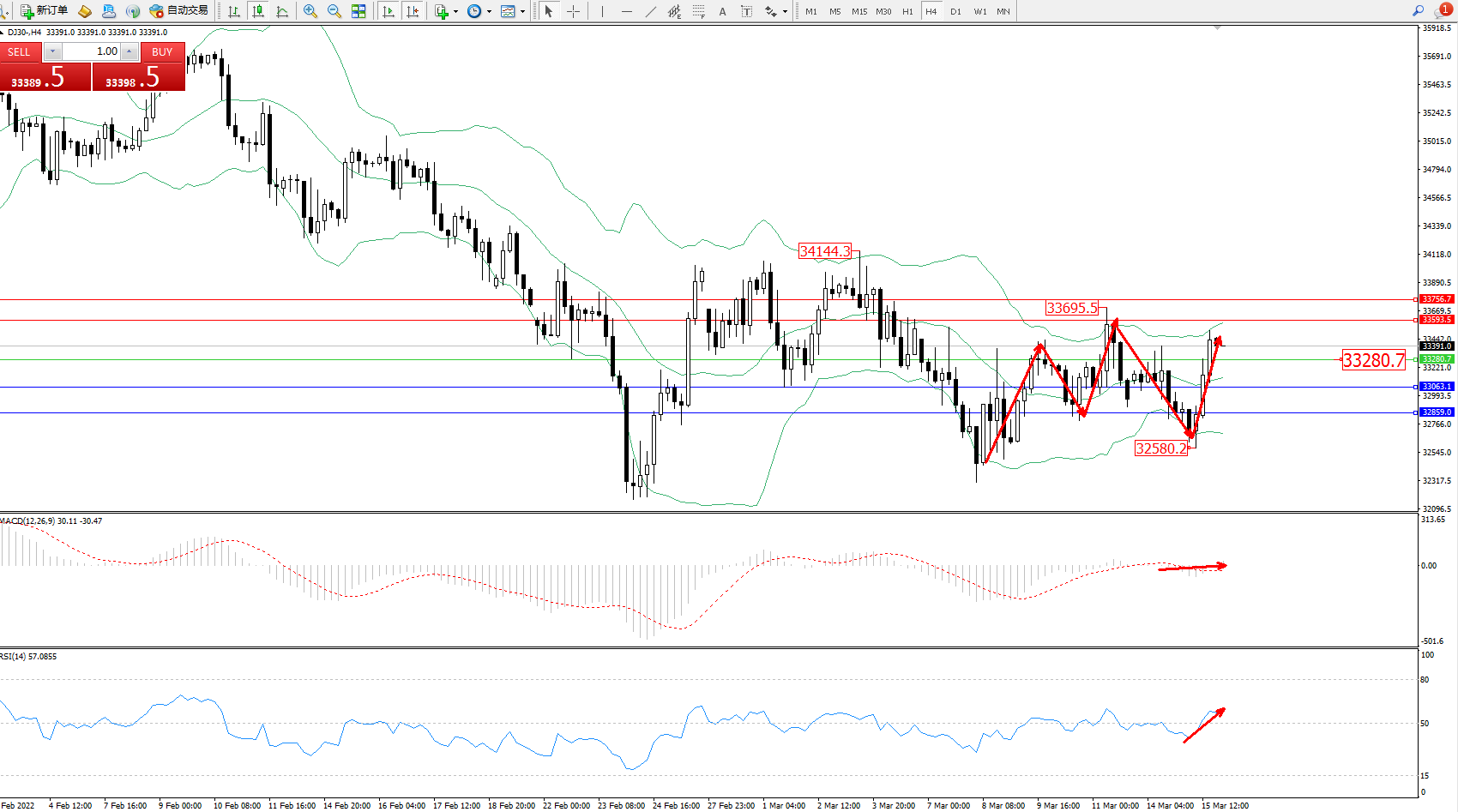 道琼斯指数DJ30——4小时K线图显示: