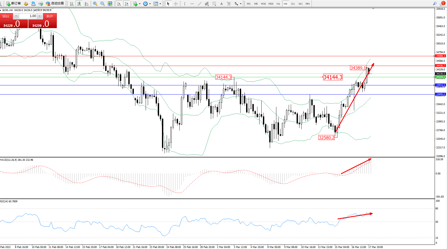 道琼斯指数DJ30——4小时K线图显示: