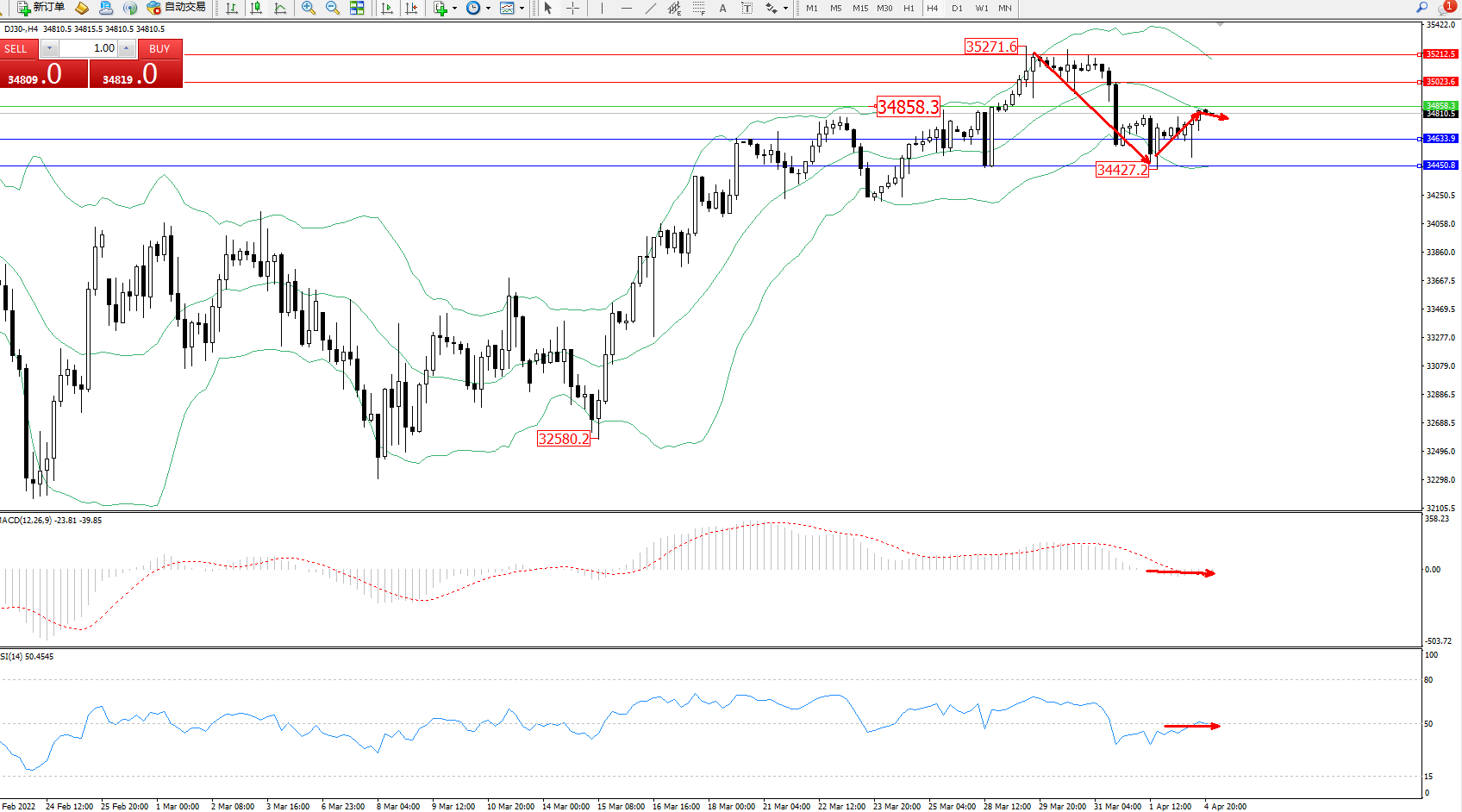 技术点评:高位空头动力延续布林带指标通道中下轨区间持续震荡下行,低位抵达34427位置短暂得到支撑反转上移,触及布林带指标中轨位置后开始整理,短期空头动力有迹象继续向下移动态势,布林带指标呈收口走势中,MACD指标处于0轴线附近弱势徘徊中 ,RSI指标处于50均衡线附近弱势整理中;