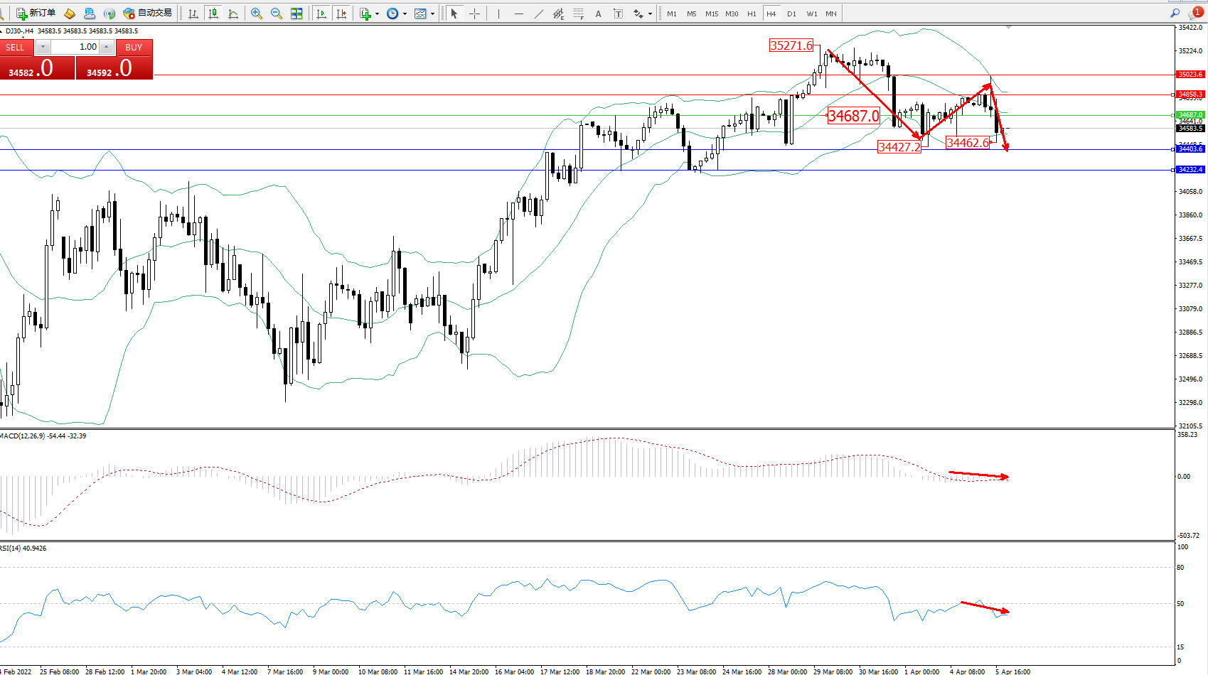 道琼斯指数DJ30——4小时K线图显示: