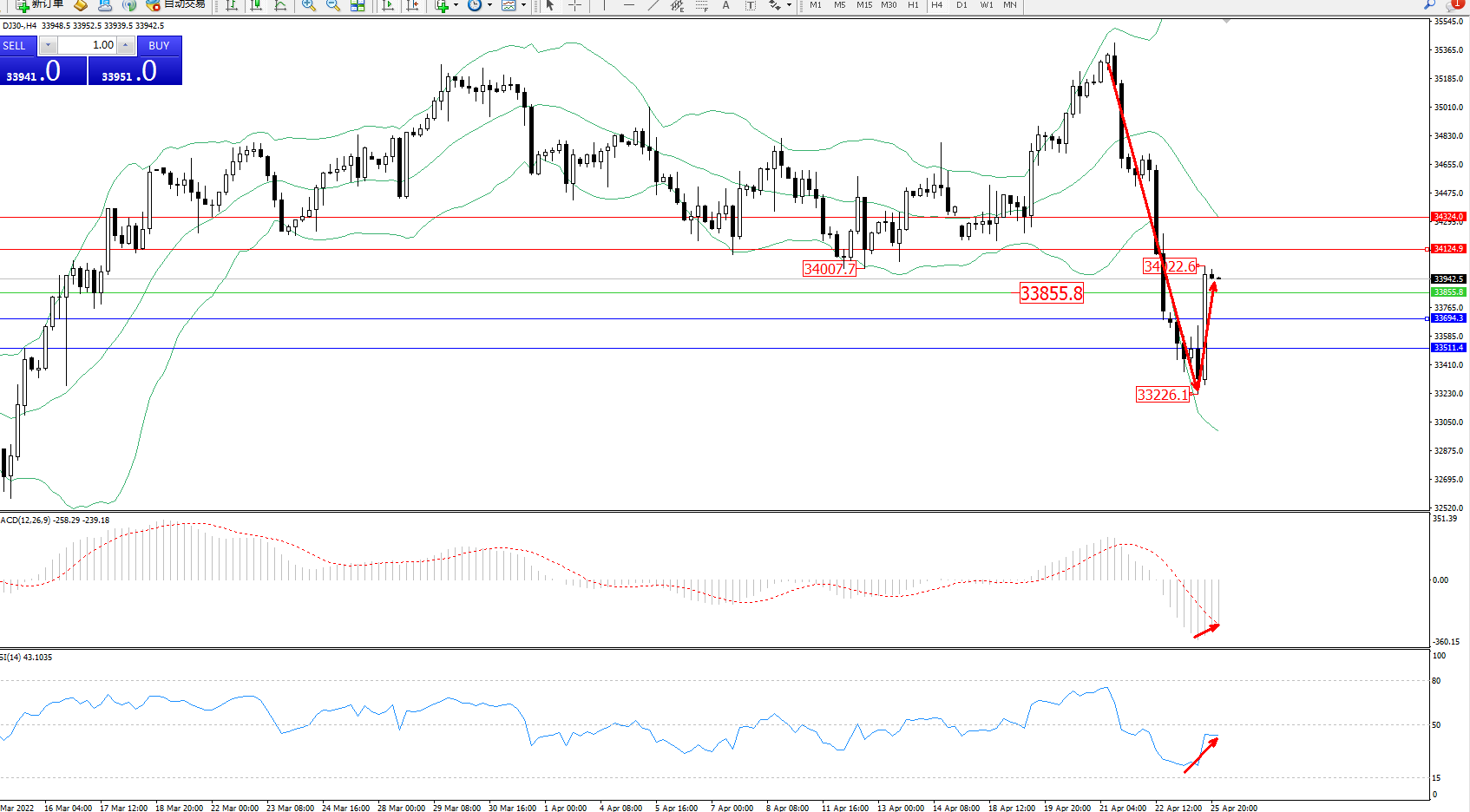 道琼斯指数DJ30——4小时K线图显示: