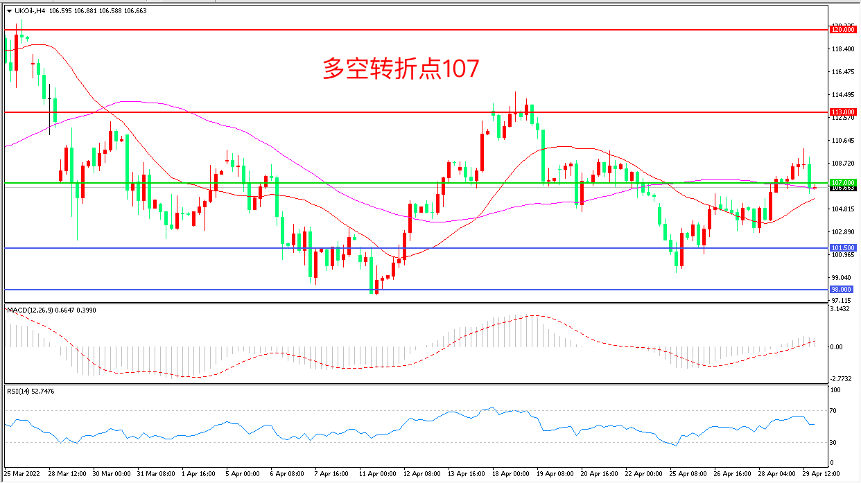 4小时图看,油价回踩21周前均线后冲高回落,短线走势陷入震荡,107美元成为多空分水岭,MACD红柱增加,RSI指标走平,日内震荡上行概率较大。