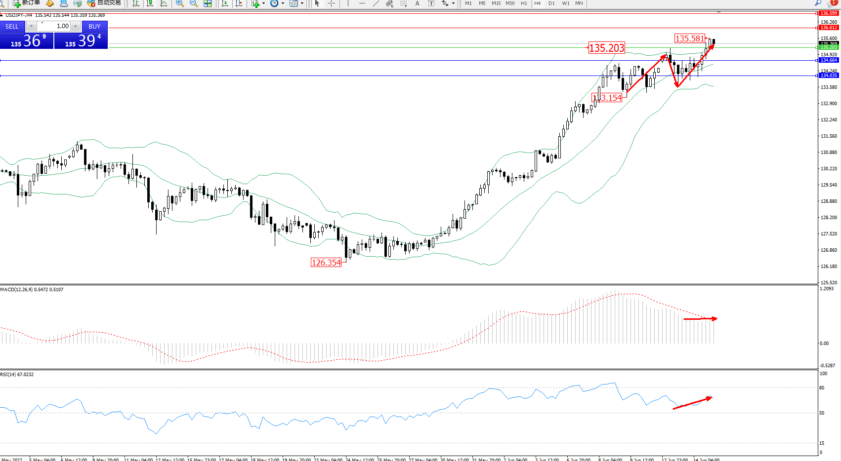 交易策略:135.203上方看涨,目标136.012、136.599