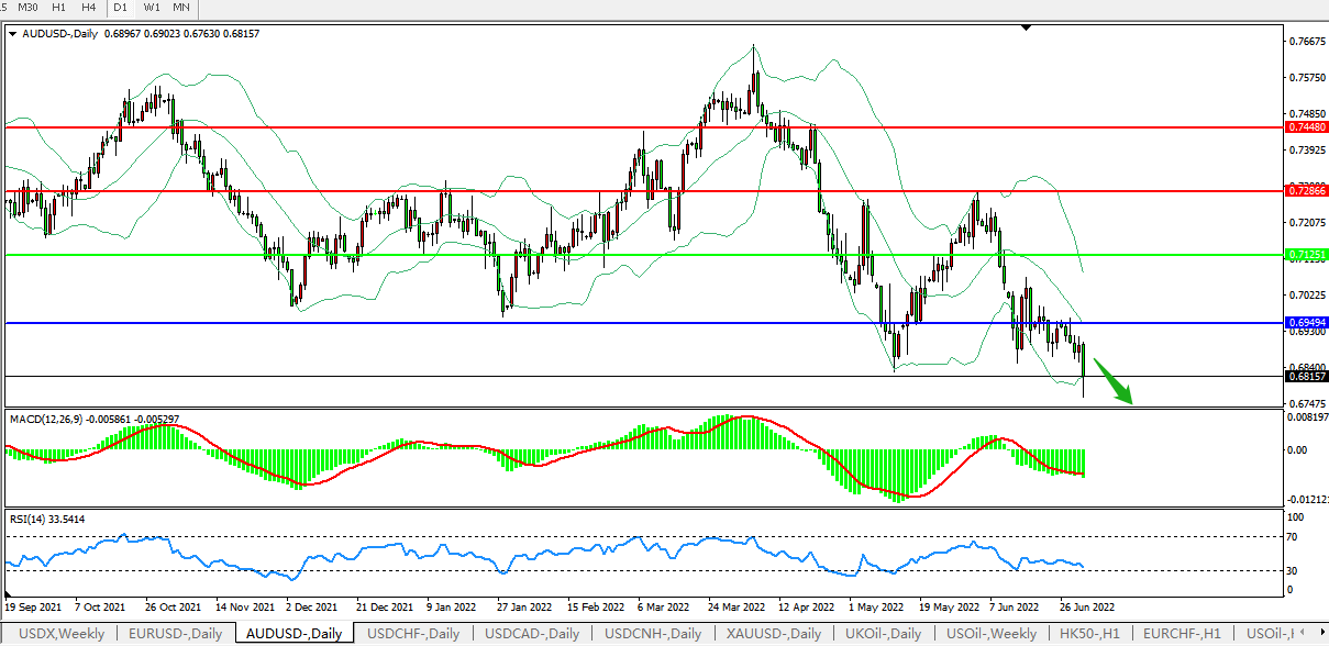 日线图看:短期汇价延下轨持续下行汇价有突破下行迹象布林带指标呈收敛走势并逐步下行,MACD运行于0轴下方且量能持续放量,RSI迅速走弱,预计汇价大概率将在反弹后进一步下行。