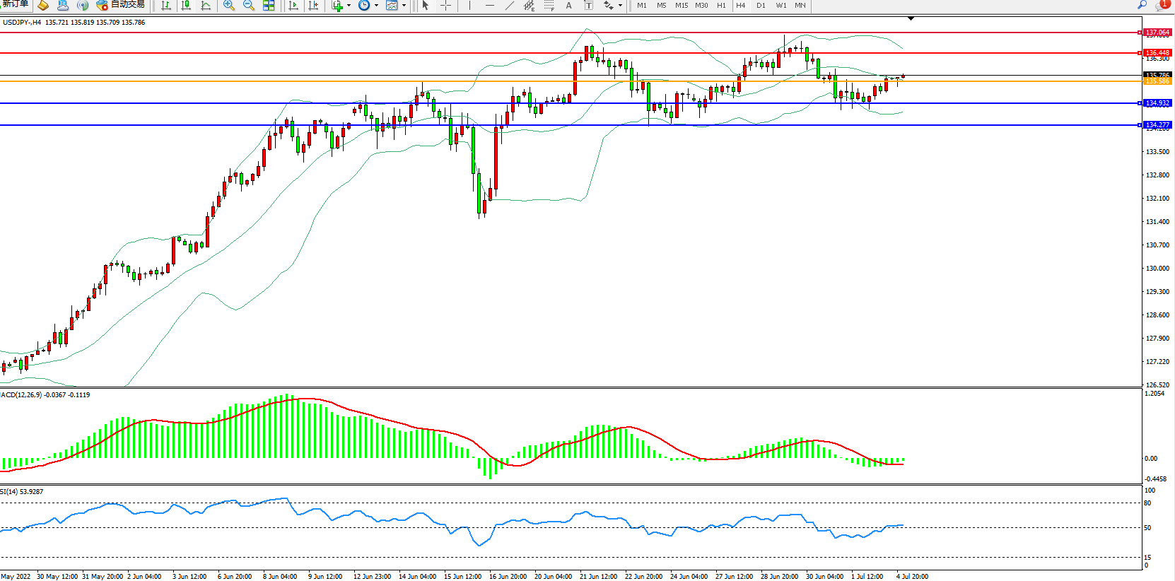 4小时图看:长时间维持在布林带指标通道内宽幅震荡,波幅空间有收窄迹象,布林带指标呈收口走势中,MACD指标处于0轴线下侧徘徊,RSI指标处于50均衡线上側窄幅整理;