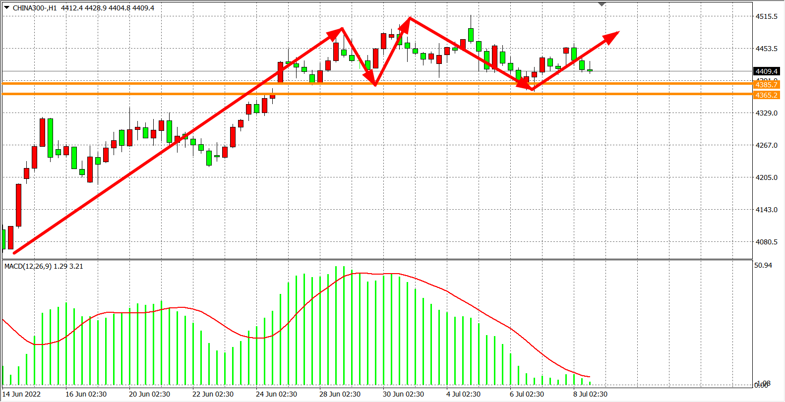 1小时图看,沪深300反弹4460后出现受阻,总体仍处于窄幅区间震荡,下方强支撑区域4385-4365依旧有效,在支撑之上依旧存在上行动能