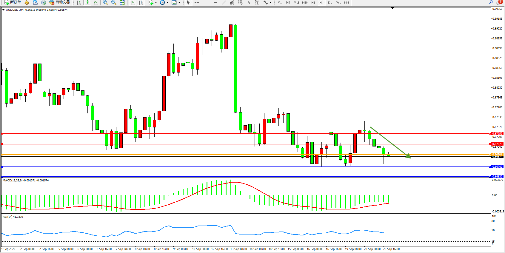 澳元美元AUDUSD——4小时K线图显示: