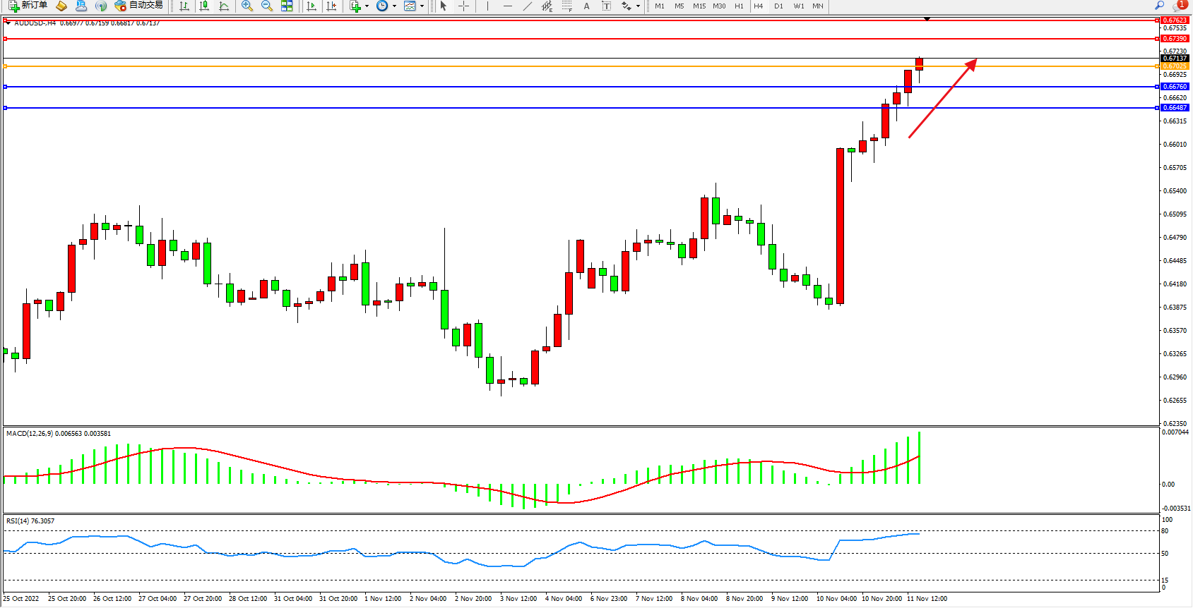 澳元美元AUDUSD——4小时K线图显示: