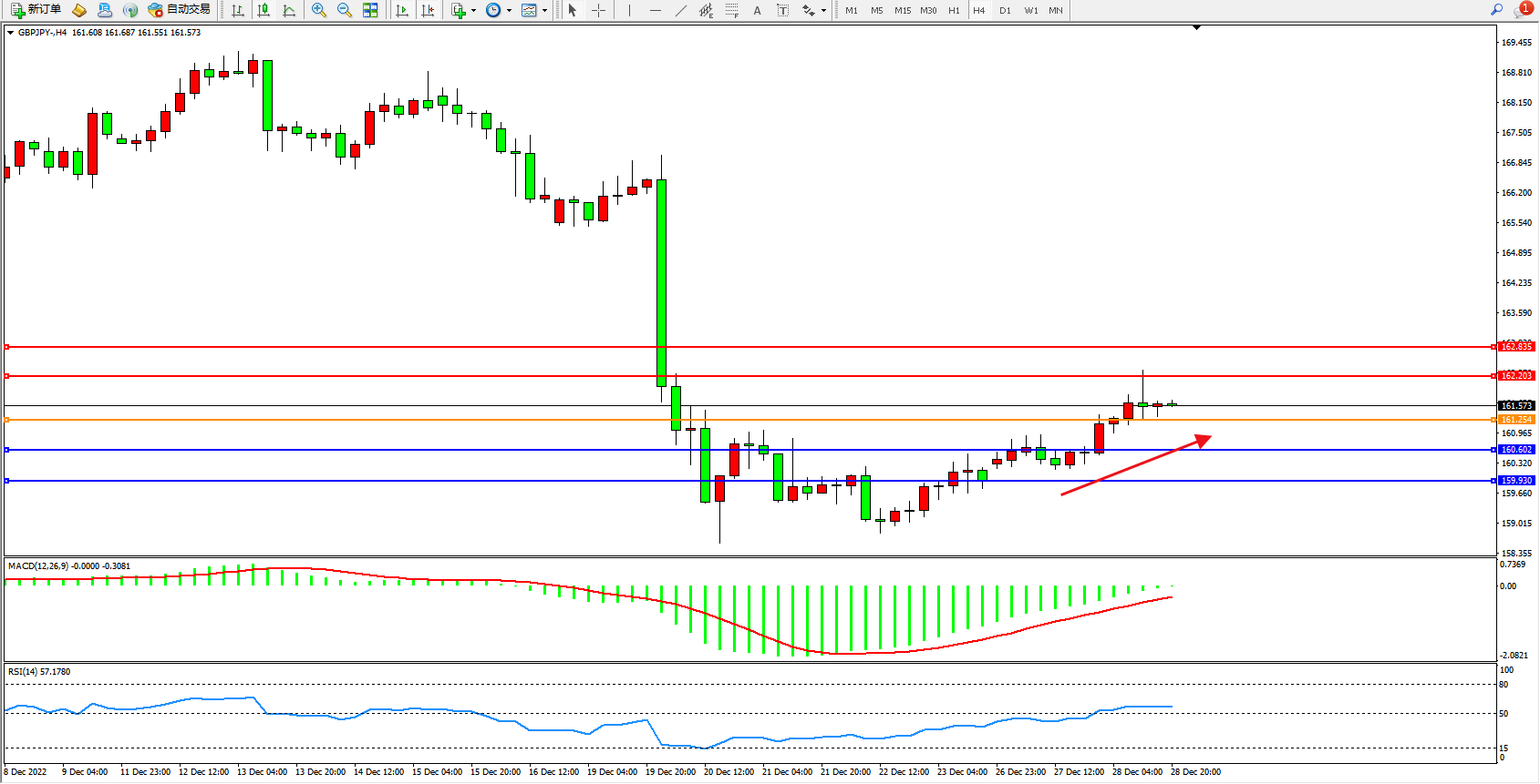 英镑日圆GBPJPY——4小时K线图显示: