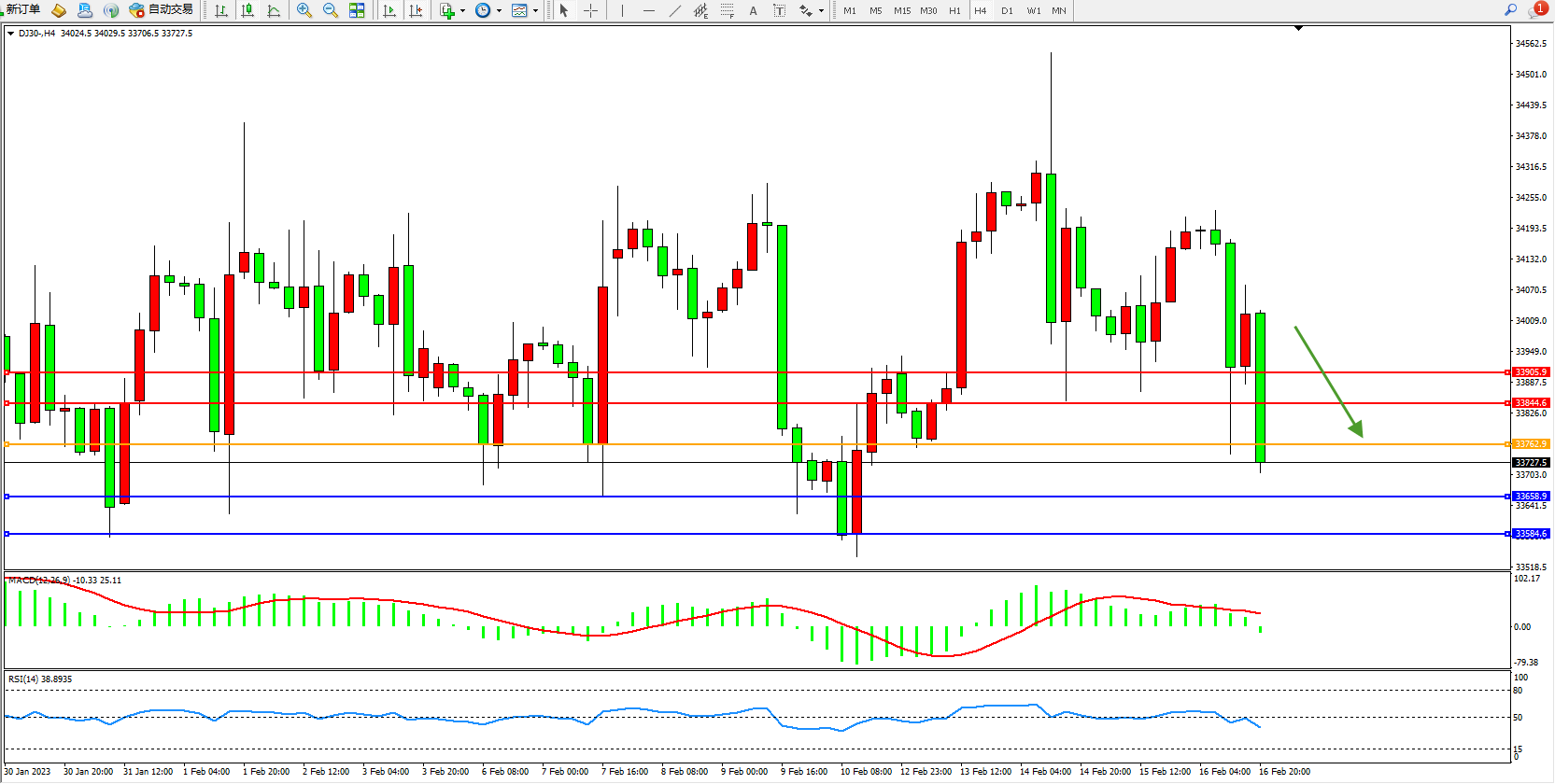 道琼斯指数DJ30——4小时K线图显示: