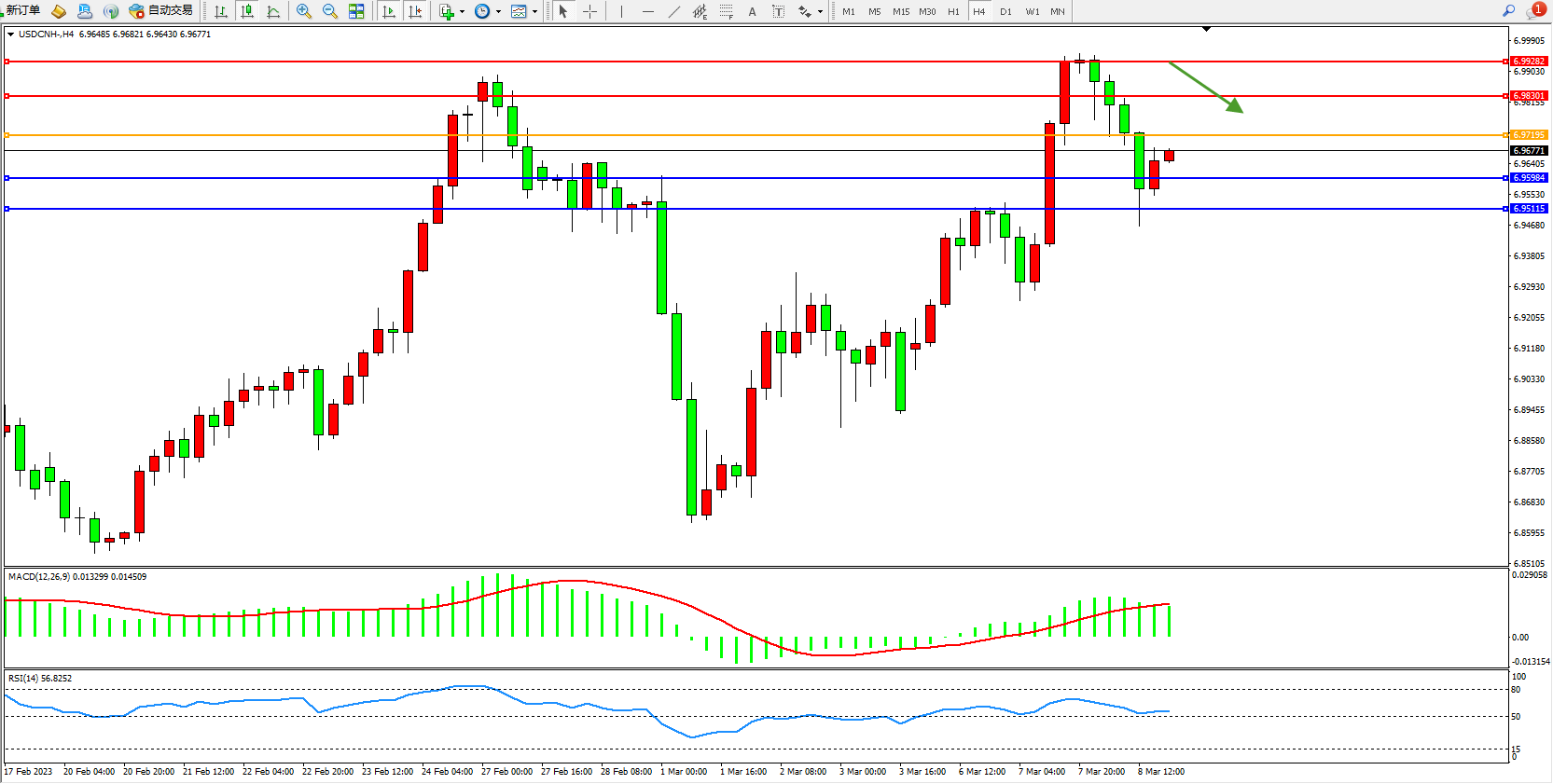 交易策略:6.97195下方看跌,目标6.95984 6.95115
