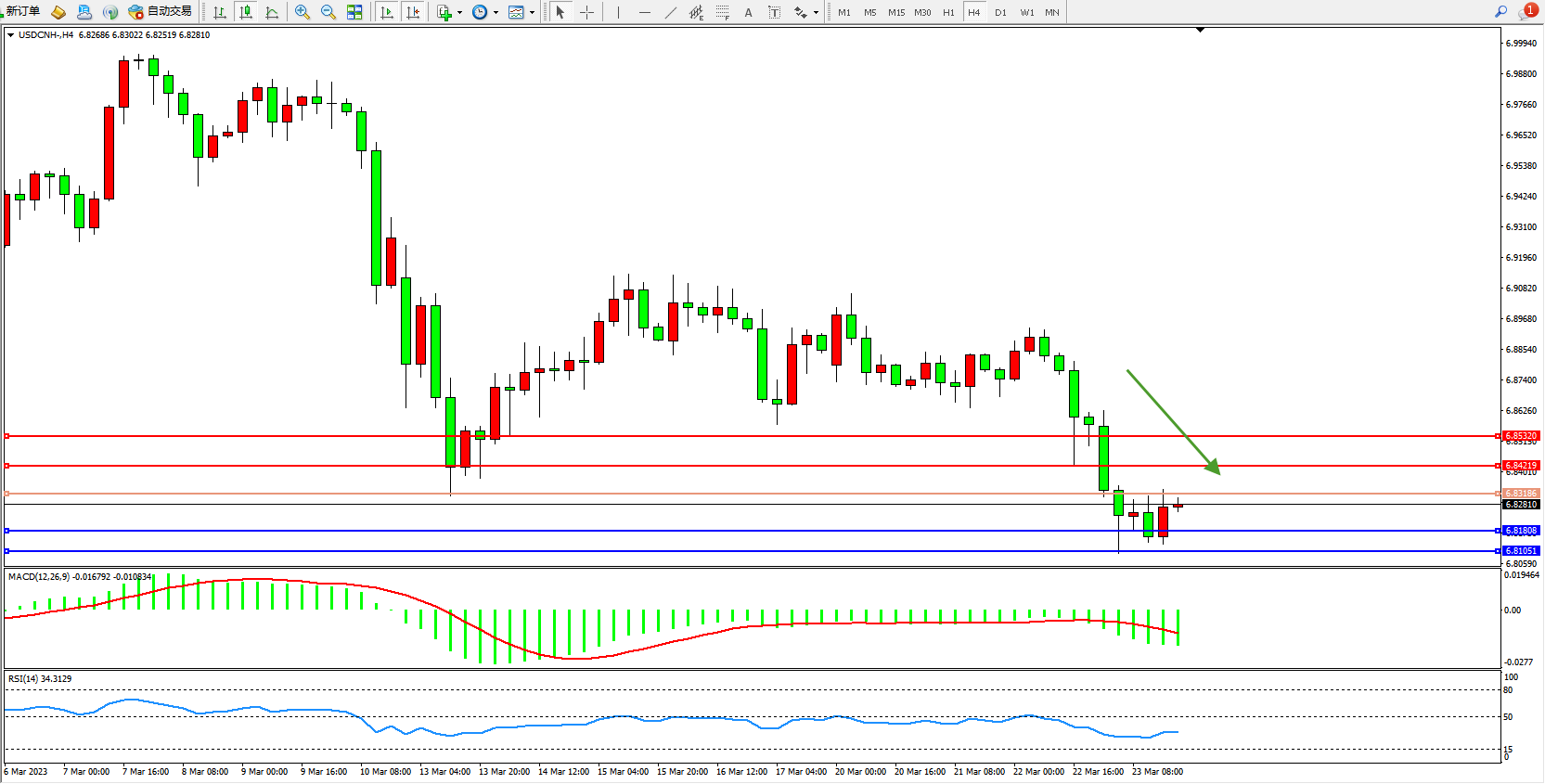 4小时图看:空头动力维持震荡下移,短期下移走势或将延续,MACD指标处于0轴线下侧空头区域整理,RSI指标处于空头区域维持徘徊;