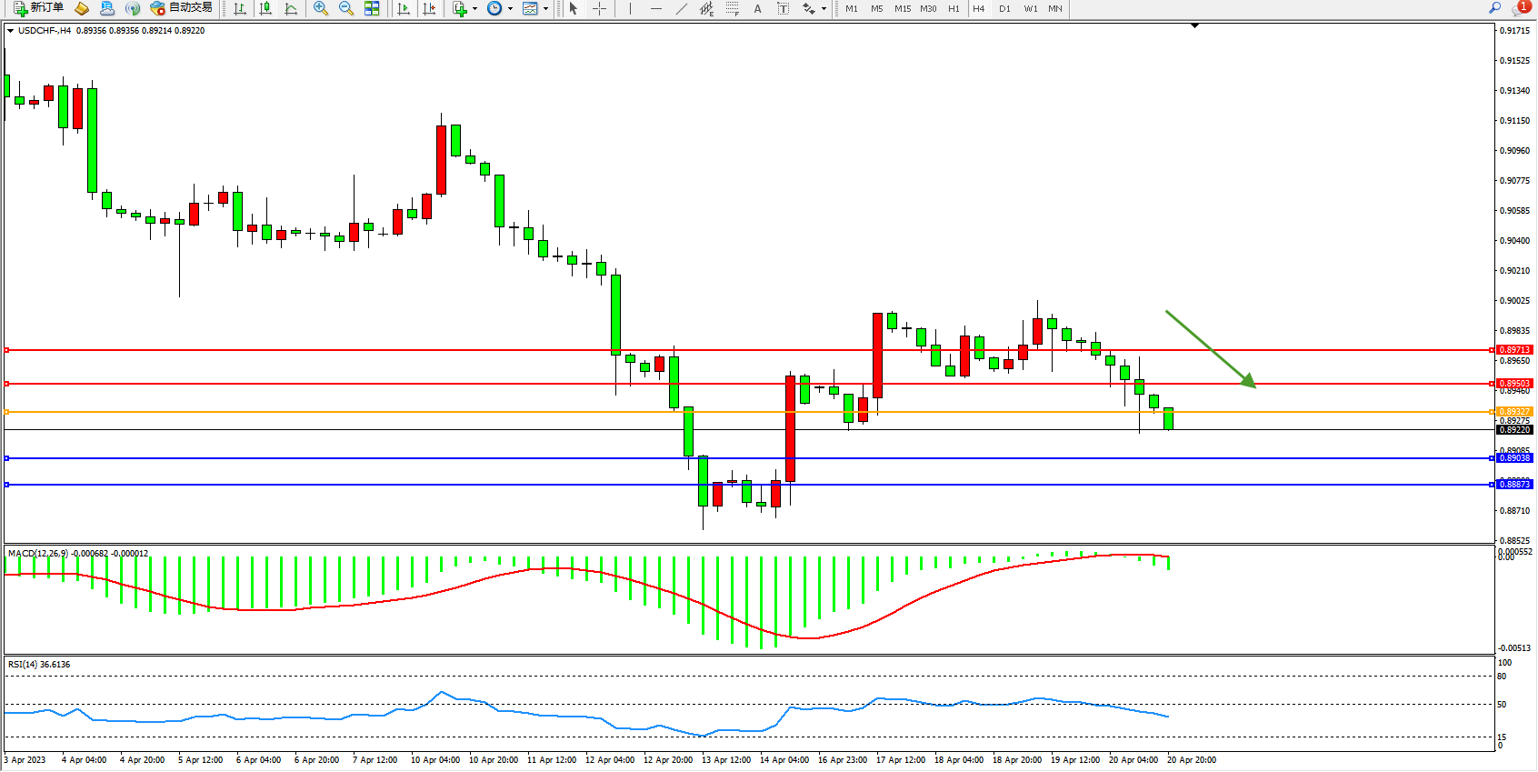美元瑞郎USDCHF——4小时K线图显示: