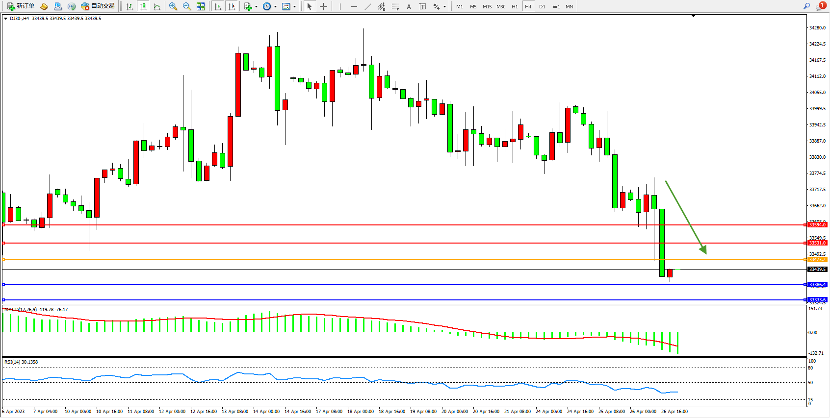 道琼斯指数DJ30——4小时K线图显示: